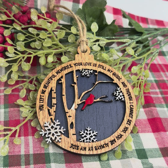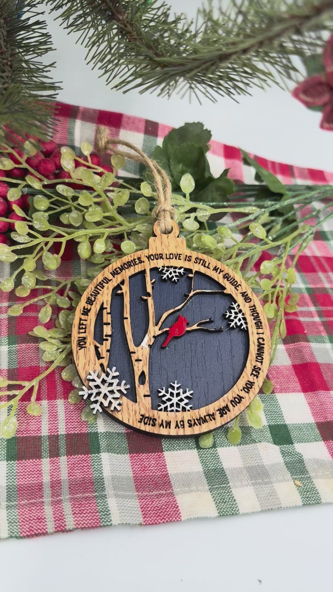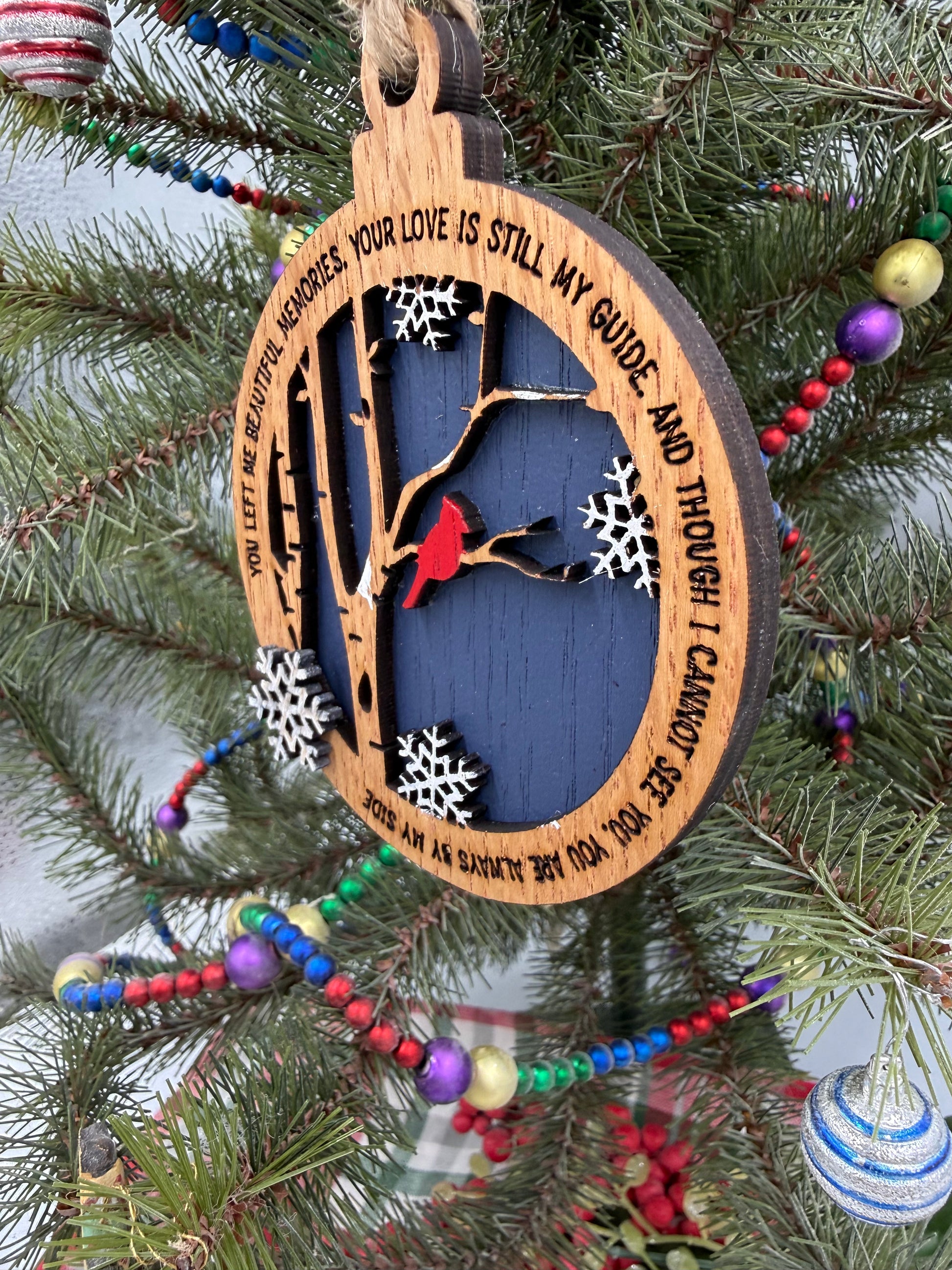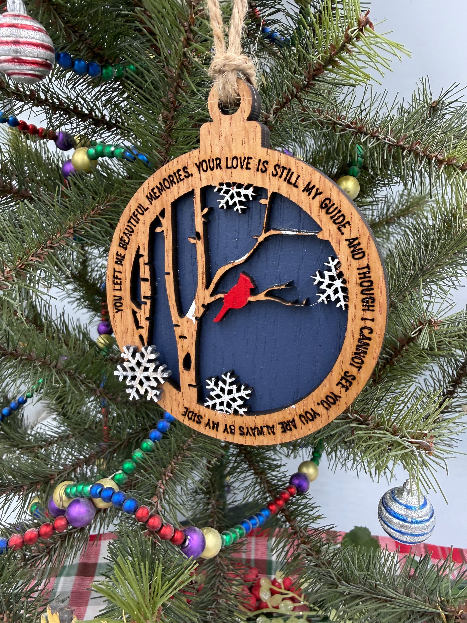 Honor the cherished memories of your loved one with our beautifully crafted laser engraved layered memorial ornament. Featuring a delicate cardinal—symbolizing love and remembrance—this heartfelt piece is engraved with the touching message: