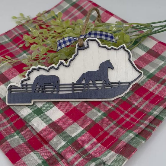 Celebrate Kentucky’s unique spirit this holiday season with our expertly crafted two-layered wood Christmas ornament. The base layer precisely captures the silhouette of Kentucky, while the top layer depicts graceful horses grazing behind a rustic fence, adding authentic countryside charm. Measuring 6" wide by 3" tall, it fits beautifully on your tree or displayed on its own. White background with blue foreground. This ornament brings a refined, local touch to your festive décor.