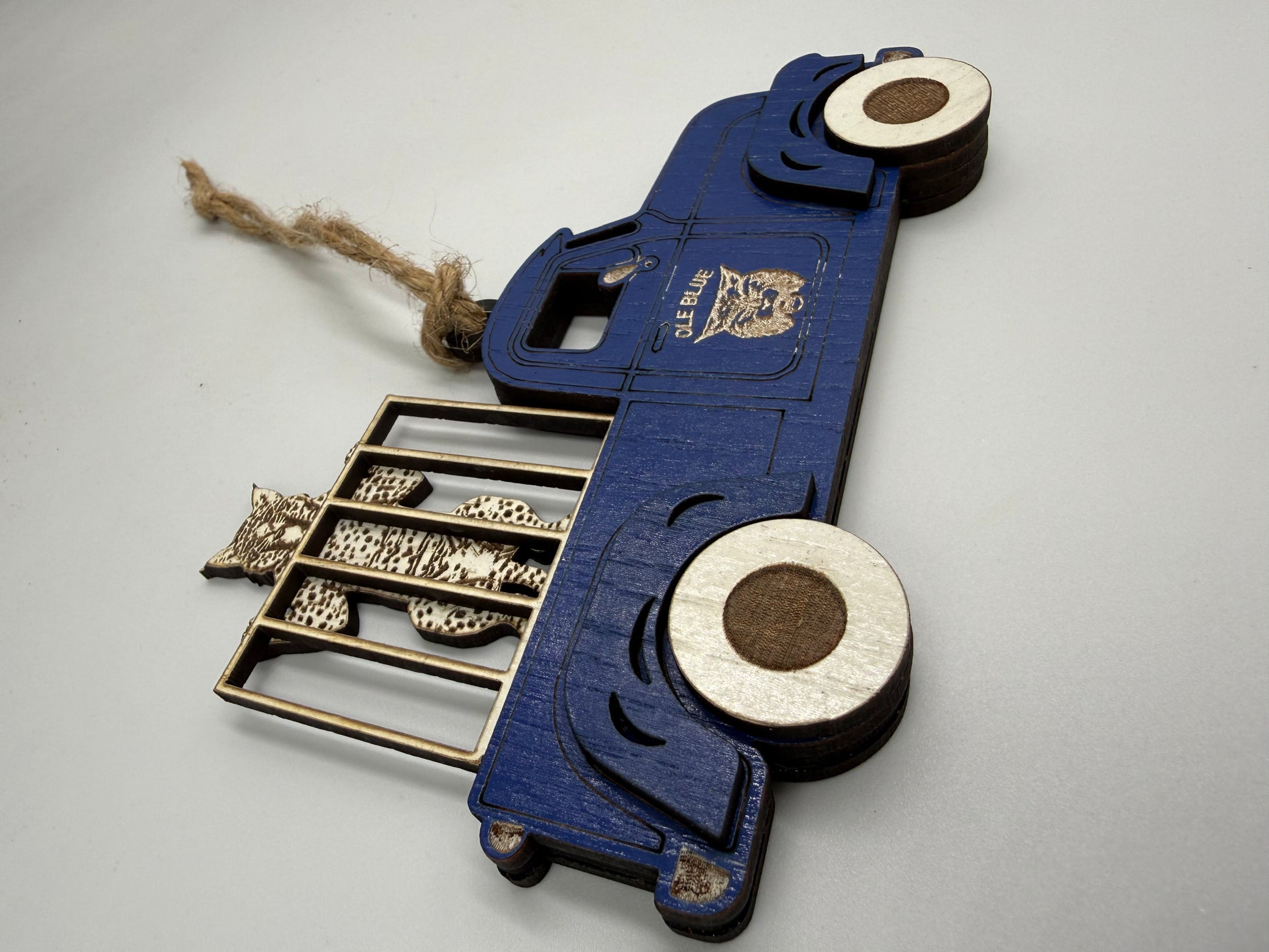 This beautiful layered Christmas ornament is for all the Kentucky fans out there. This nostalgic old truck is painted Kentucky blue with a wildcat and “Old Blue” on the truck door and is hauling a cage with a wildcat in the bed. Makes a perfect gift to celebrate Kentucky sports tradition or perfect for any Christmas tree. Comes with jute hanging string.