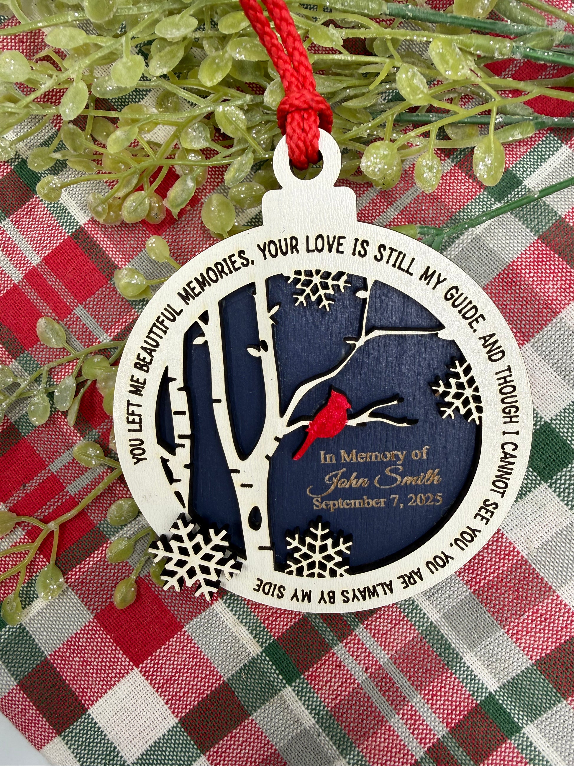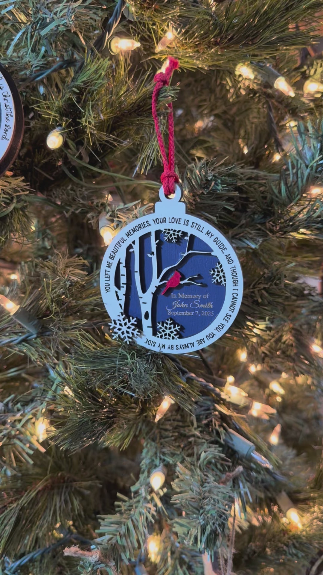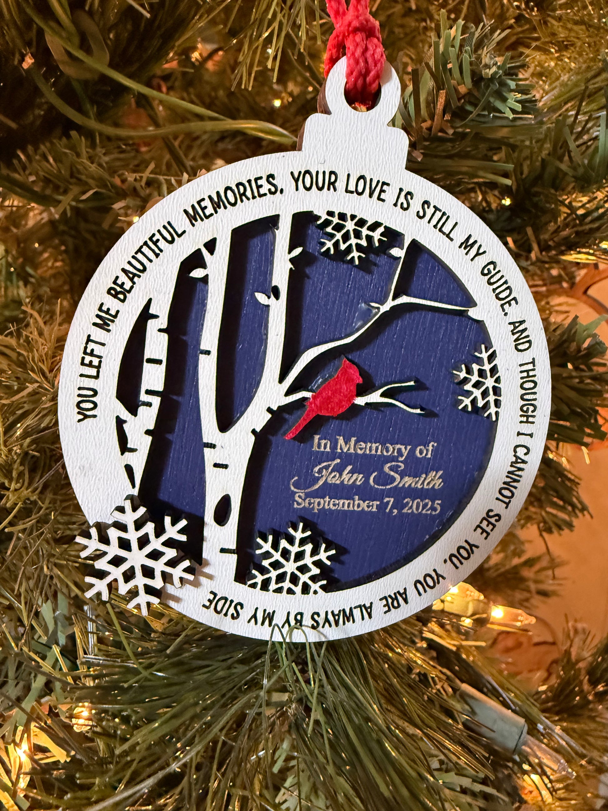Honor the cherished memories of your loved one with our beautifully crafted personalized laser engraved layered memorial ornament. Featuring a delicate cardinal—symbolizing love and remembrance—this heartfelt piece is engraved with the touching message: