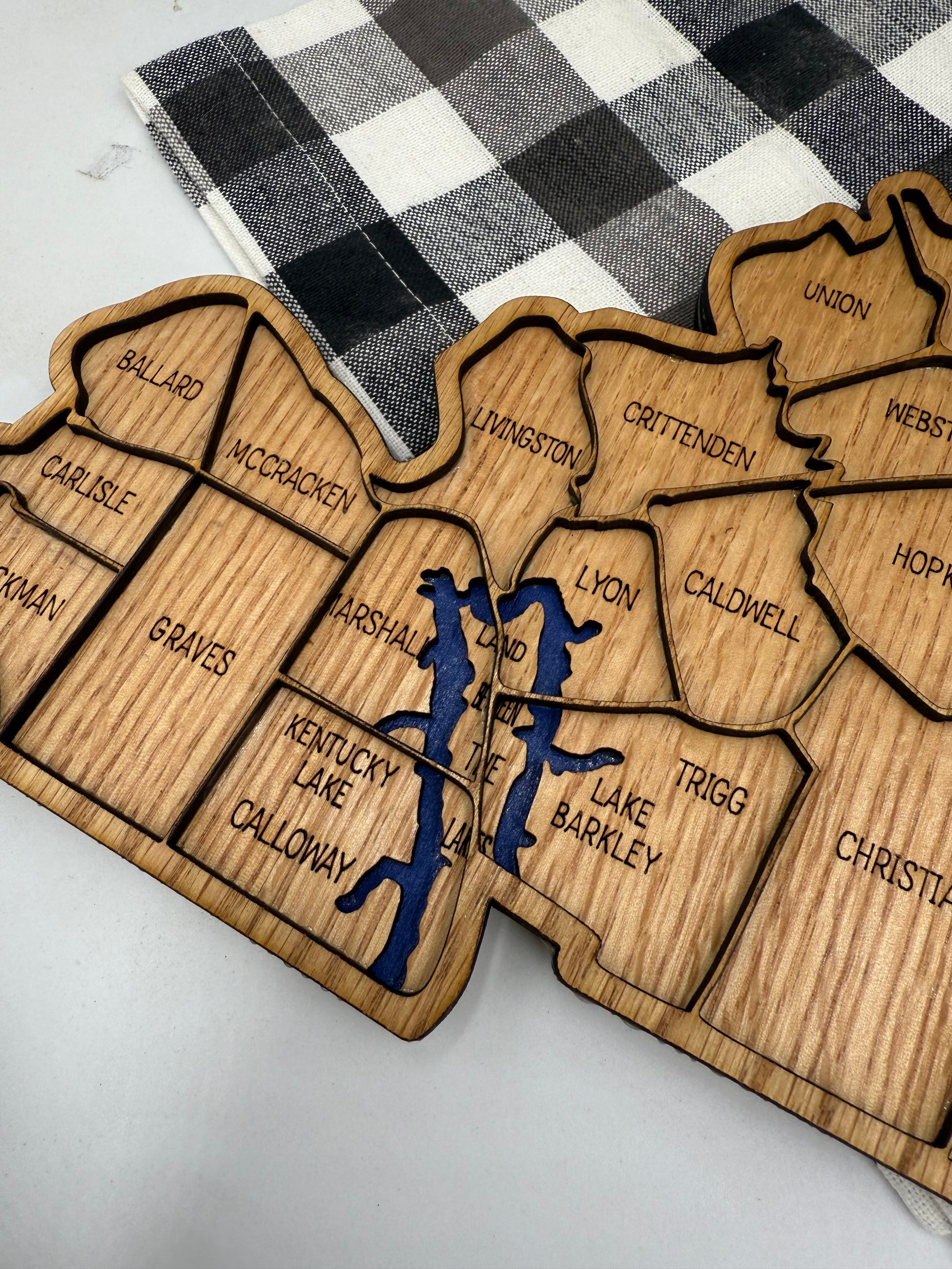 Show your Kentucky pride with this beautifully detailed laser cut and engraved wooden Kentucky county map. Each county is carefully outlined and engraved into natural wood with major lakes cut out and showing the blue back layer, creating a stunning piece of wall art that celebrates the Bluegrass State.